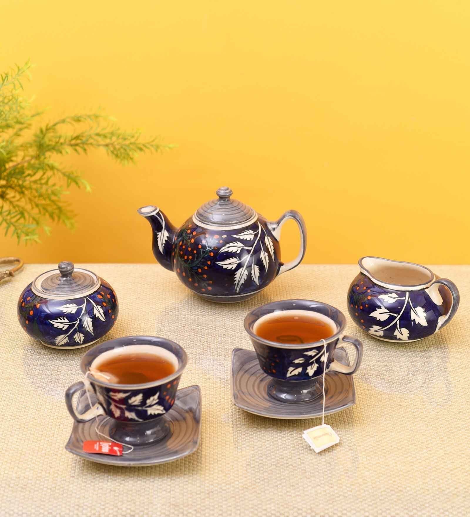 Blooming Leaves Royal Blue Ceramic 4 Pcs Tea Set,