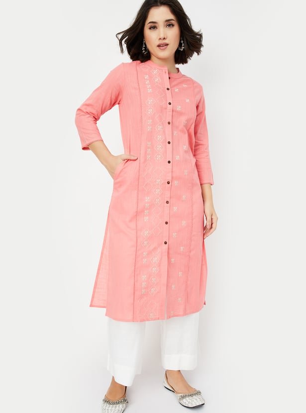 This embroidered straight kurta combines traditional charm with modern style. Featuring a band collar, 3/4th sleeves, a button placket, side slits, and a convenient side pocket, it’s designed for comfort and elegance.