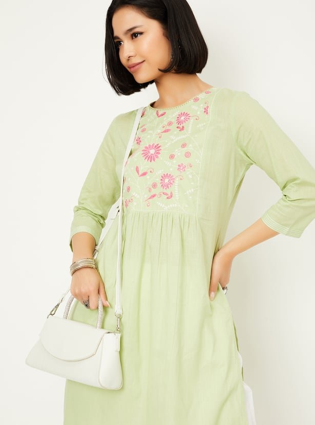 Create an effortless look with this straight kurta. It features three-quarter sleeves and a round neckline adorned with an embroidered yoke. The side slits and calf-length cut add a touch of elegance, making it a versatile piece.