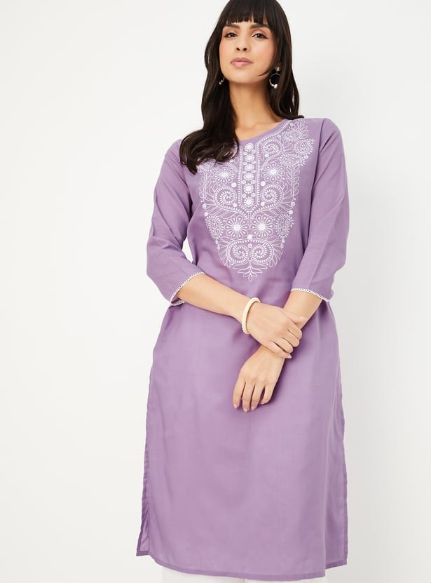 Sold by: Kleider Konzept Report AbusePaint a picture of elegance in this straight kurta. The striped pattern with a woven design adds to the allure. It showcases a round neck, three-quarter sleeves, and a convenient waist pocket.