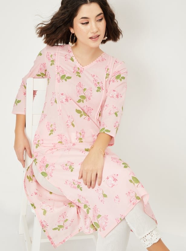 Embrace effortless elegance with this floral print straight kurta featuring delicate pleated detailing. The V-neck design adds sophistication, while the 3/4th sleeves, side slits, and convenient side pockets ensure both comfort and style.