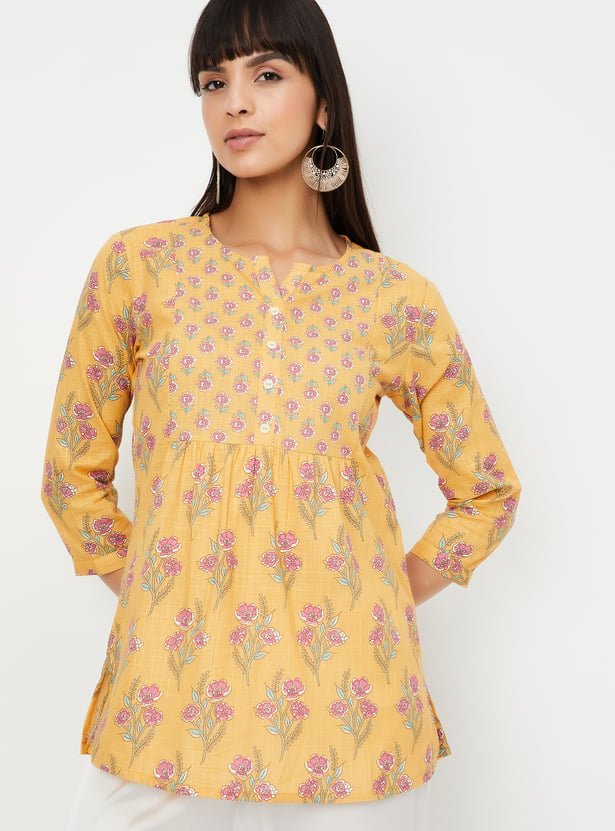 Add a pop of color to your wardrobe with this floral print A-line kurti. Featuring a round neck, button closure, and 3/4th sleeves, it offers a blend of comfort and style with a vibrant, feminine touch.