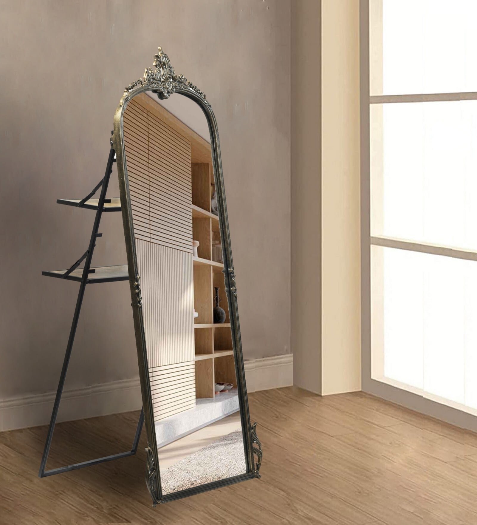Be the first to review “Metal Victorian Arched Floor Mirror with Stand,”