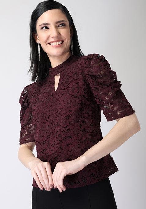 Pick this chic lilac top for the sunny days ahead. Tailored in lace, it comes with a keyhole neck and a ruching detail on the sleeves.