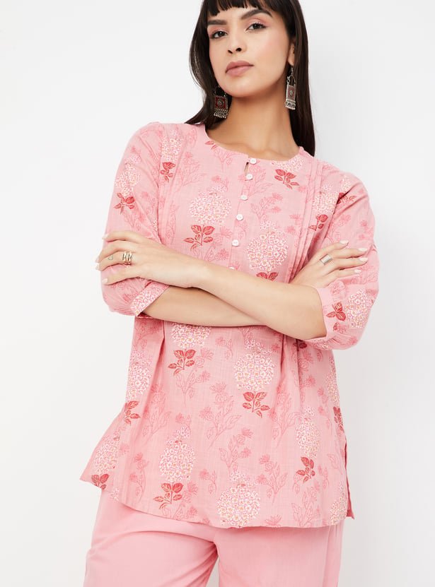 This floral print short kurti features a vibrant, eye-catching pattern with a classic round neck and 3/4th sleeves. Perfect for adding a pop of color and style to your casual wardrobe, it’s both comfortable and chic.