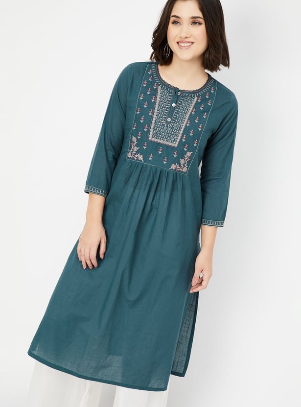 This embroidered straight kurta combines traditional charm with modern style. Featuring a band collar, 3/4th sleeves, a button placket, side slits, and a convenient side pocket, it’s designed for comfort and elegance.