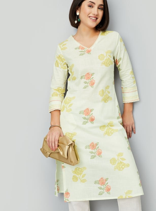 Paint a picture of elegance in this straight kurta. The floral prints add a sophisticated touch, while the waist pocket offers convenience. It features a V-neck and three-quarter sleeve with lace trim for added allure.