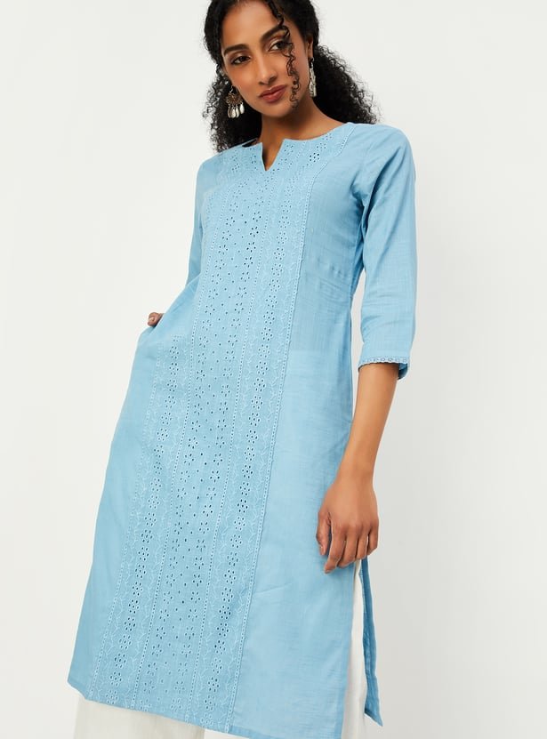 Glam up with this straight kurta with a schiffli design, a notched neck, three-quarter sleeves, pockets and calf-length construction.