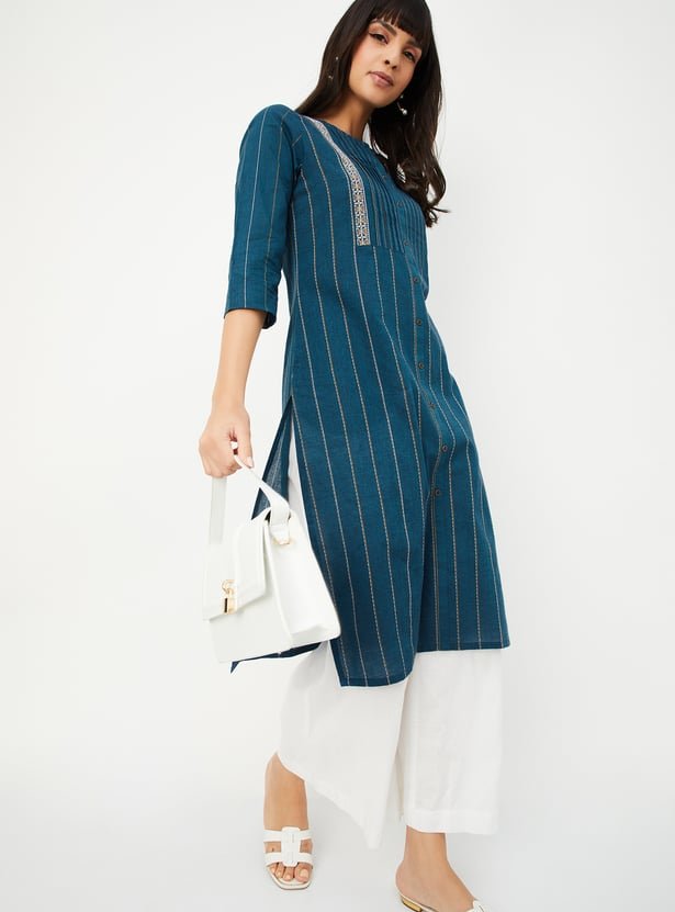 Glam up with this straight kurta with a schiffli design, a notched neck, three-quarter sleeves, pockets and calf-length construction.