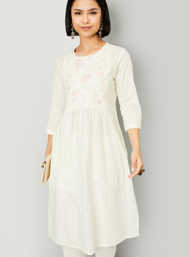 Create an effortless look with this straight kurta. It features three-quarter sleeves and a round neckline adorned with an embroidered yoke. The side slits and calf-length cut add a touch of elegance, making it a versatile piece.