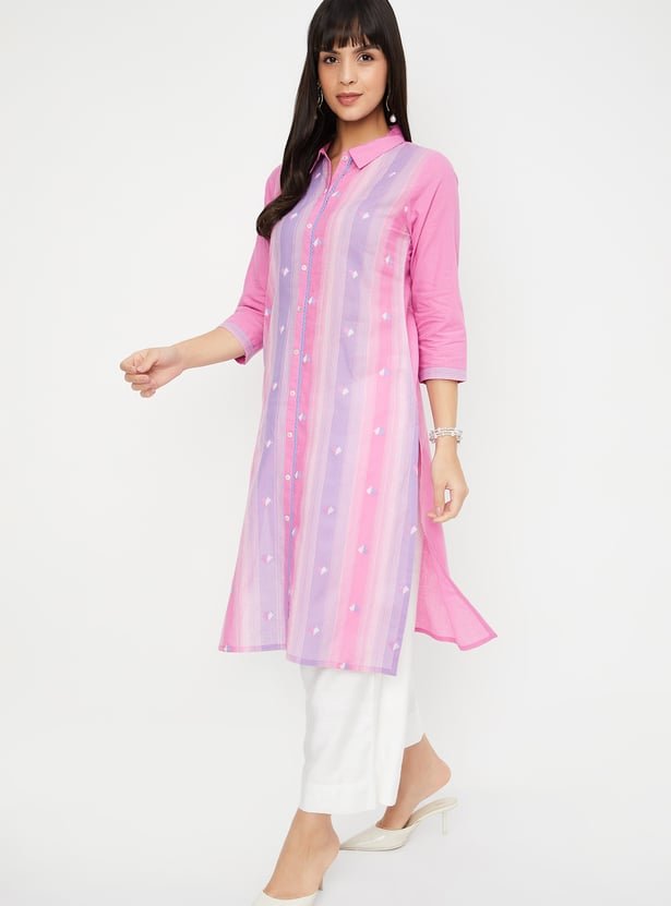 Add a touch of elegance to your wardrobe with this embroidered straight-fit kurta. Featuring a spread collar, button placket, and 3/4th sleeves, it combines traditional style with modern comfort. The front and side slits, along with a side pocket, offer a practical yet stylish design.